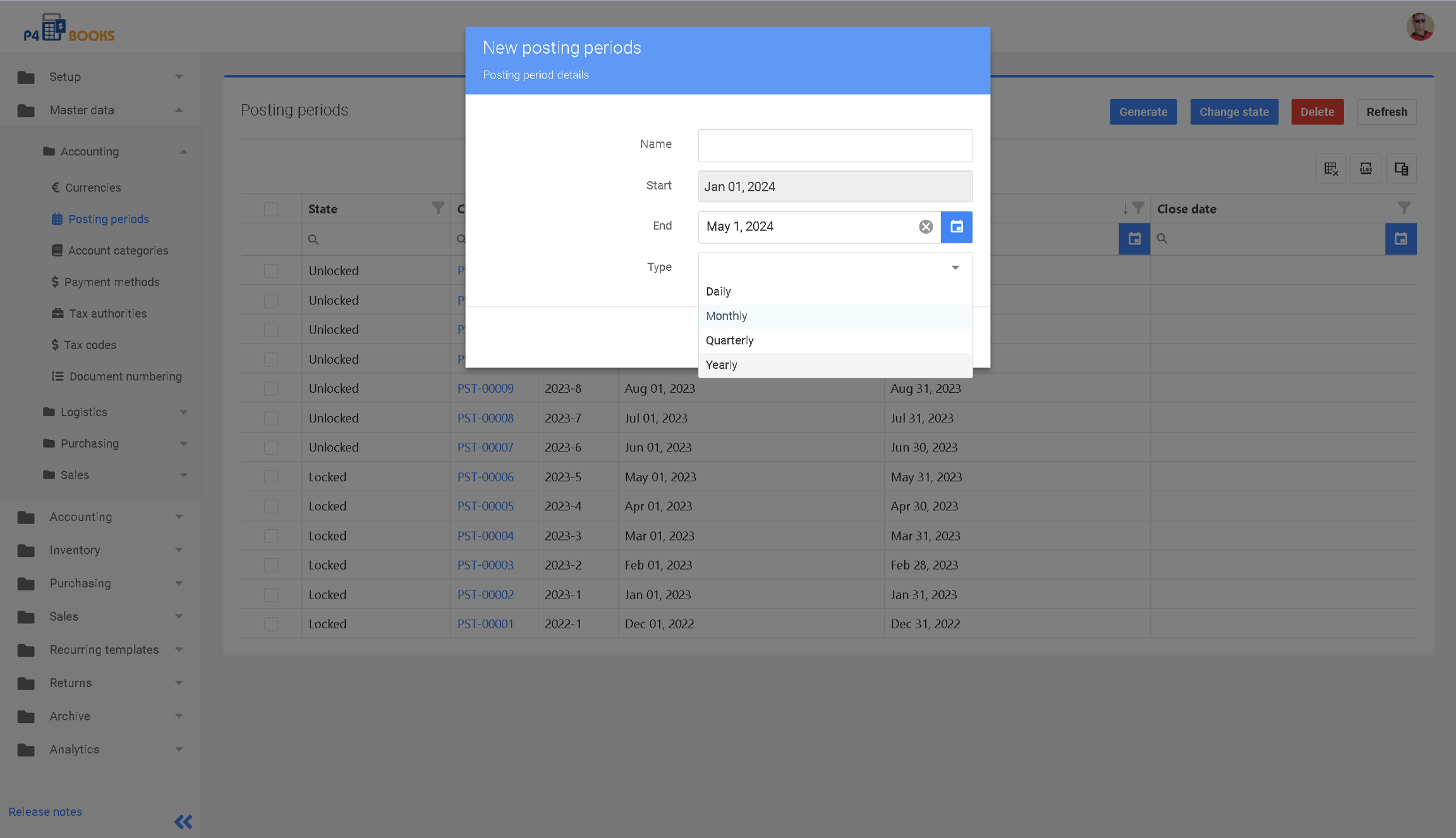 Diario, Mensual, Trimestral, Anual son las opciones de periodos de contabilización en P4 Books. Para configurar los periodos de contabilización vaya a: Master Data> Accounting > Posting Periods