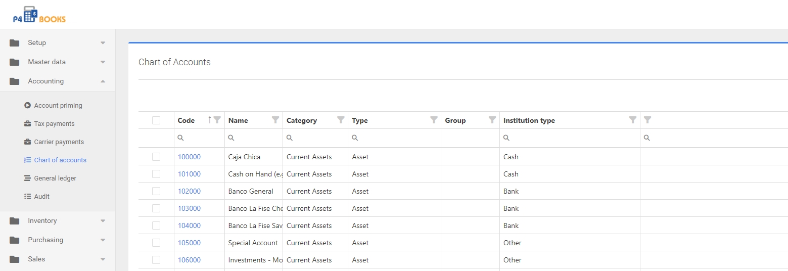 El plan de cuentas es la base de cualquier sistema contable, aquí puede renombrar cuentas, borrar cuentas, crear nuevas cuentas. Hay cuentas predeterminadas preasignadas a las funciones, en el caso de que cambie estas le recomendamos que hable con su contador para asegurarse de que tiene las cuentas que necesita antes de empezar a hacer transacciones.