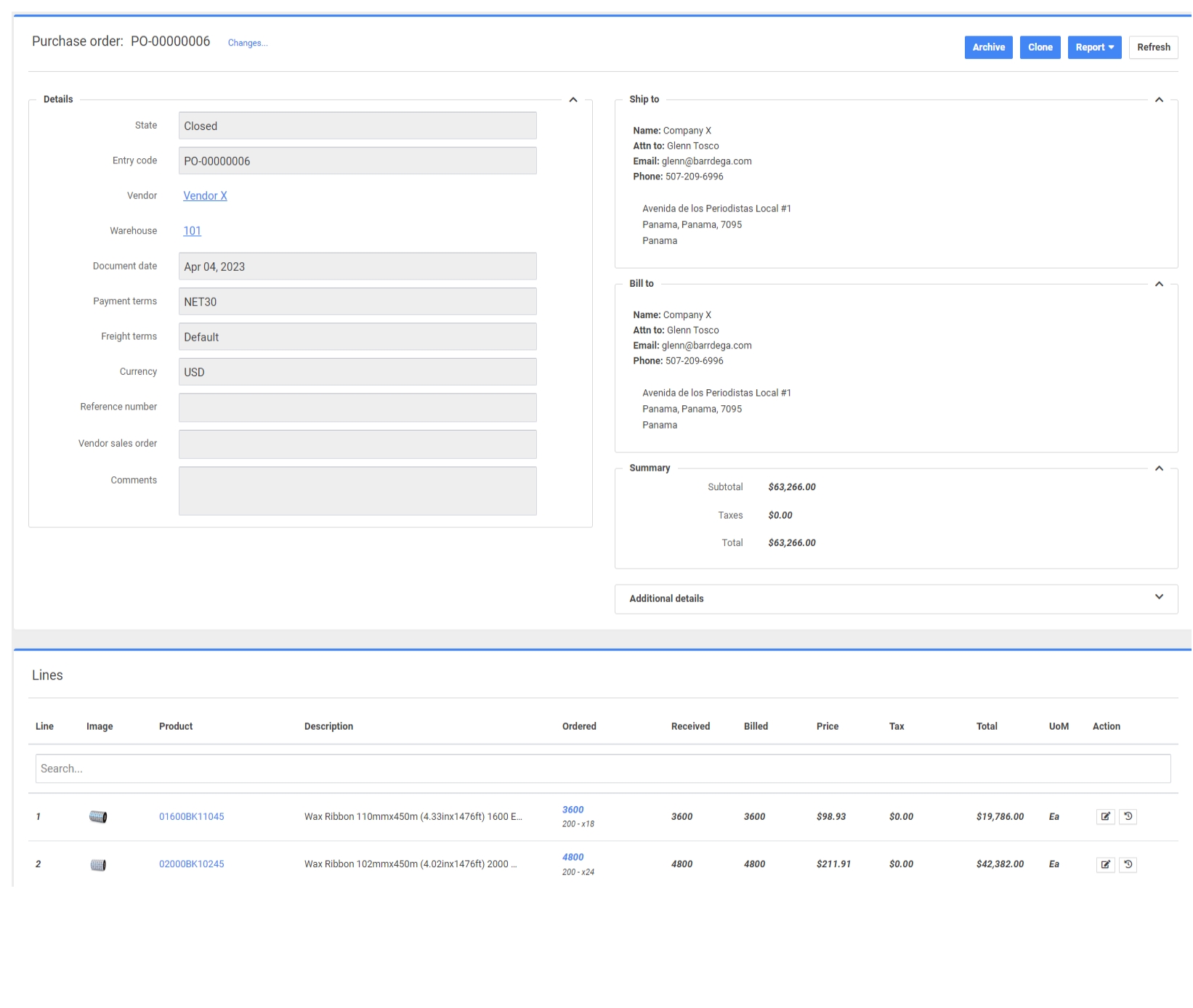 Una orden de compra es un documento que usted envía a sus proveedores y en el que se detallan todos los artículos que tiene previsto comprarles y su coste. Después de que su proveedor acepte la orden de compra, usted esperará a que lleguen los productos para generar un documento de recepción, luego generará una factura de proveedor y, finalmente, un pago de proveedor.