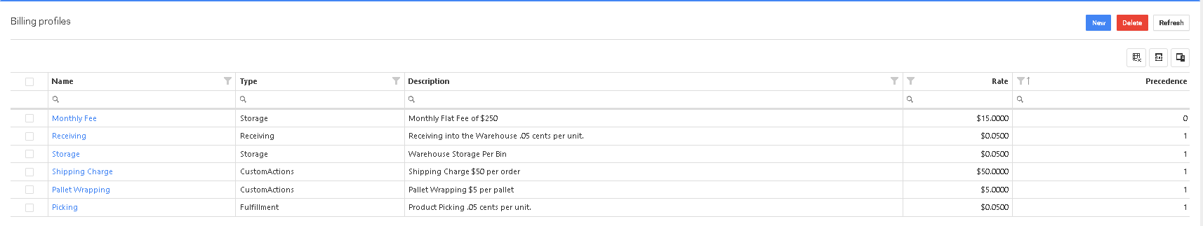 Mediante la creación de diferentes perfiles de facturación, puede facturar al cliente 3PL correctamente la primera vez. Puede haber varios perfiles para la misma tarea, en el caso de que facture a los clientes 3PL de forma diferente en función del volumen o del tipo de productos.