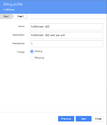 En la pantalla anterior introduzca un nombre para el perfil, este será el SKU o a veces llamado código de facturación, a continuación introduzca la descripción, esta es la descripción que se mostrará en la factura, a continuación establezca la precedencia a 1 (en el caso de que tenga varios perfiles para la misma función de almacén asignada al mismo cliente puede cambiar la precedencia para dejar que el sistema decida cómo facturar por esta tarea), establezca el tipo de cargo en este caso establézcalo en Picking.