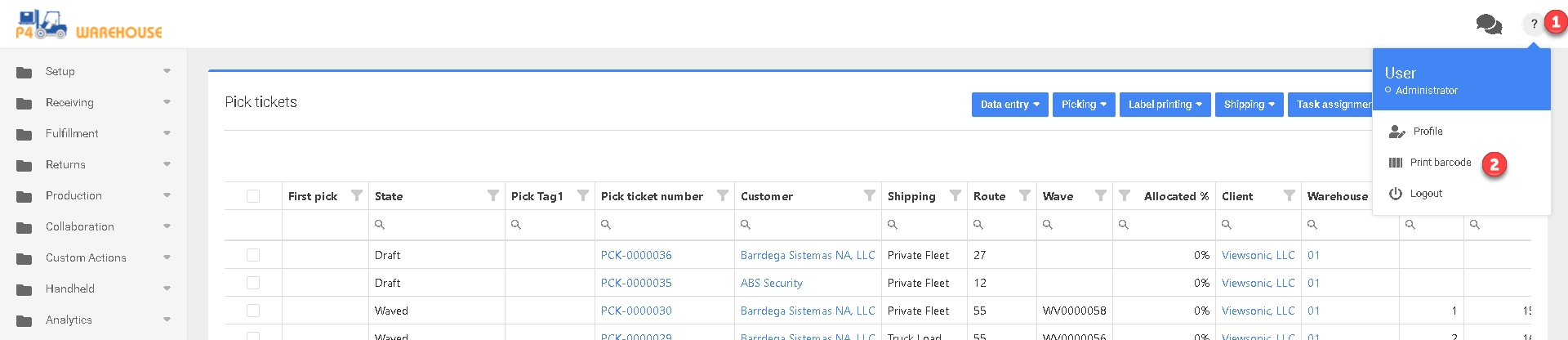 Para procesar una orden «Full Pack Picking», el despachador web detendrá su proceso después del proceso de Asignación. Para este estilo de picking usted NO agita la orden. En la parte superior derecha de la pantalla hay un icono en forma de círculo donde encontrará una opción «Imprimir Código de Barras» aquí imprimirá tantas etiquetas como personas tenga procesando el pedido.