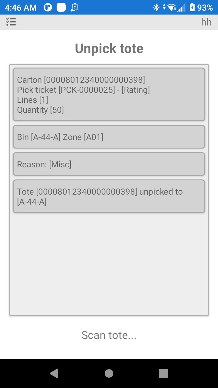 Como se puede ver en la imagen superior, el pallet se despaletiza y se devuelve a la ubicación A-44-A con una cantidad de 50.