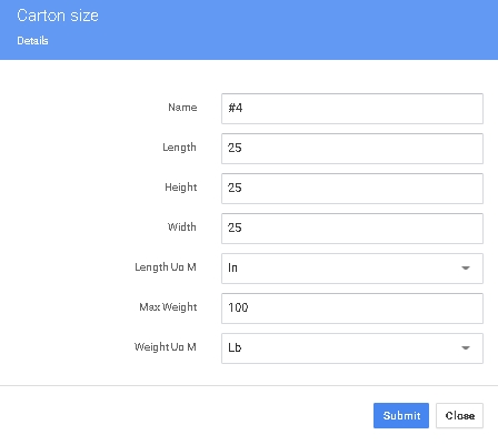 Introduzca los datos para que coincidan con las dimensiones de su caja y, a continuación, haga clic en Enviar para guardar los datos.