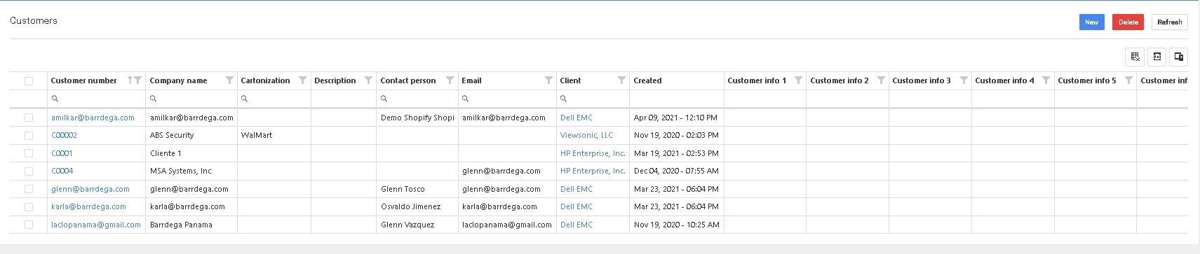 Haga clic en el botón Nuevo para añadir un nuevo cliente o haga clic en el texto azul de la columna Número de cliente para editar un cliente existente.