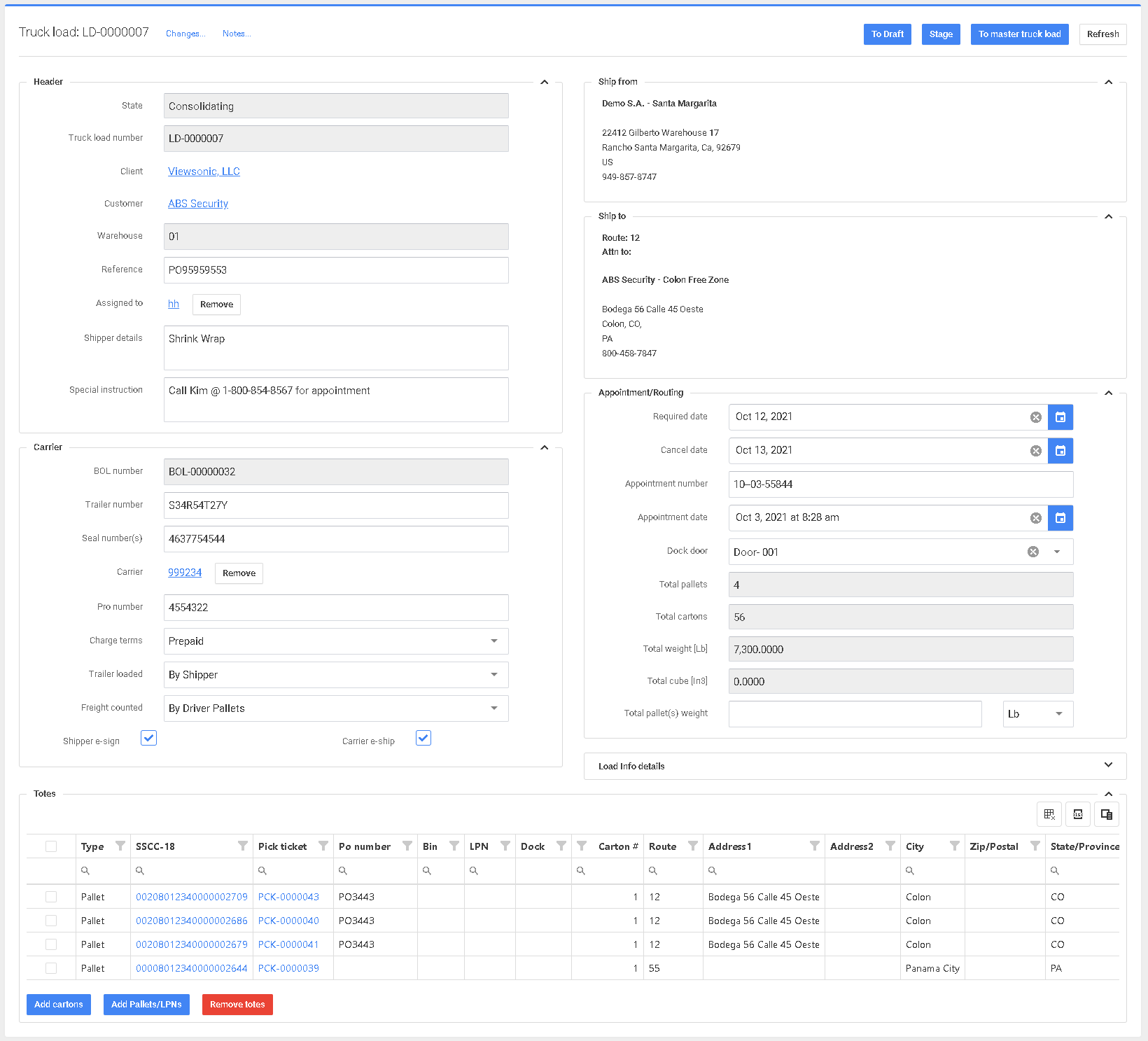 En la pantalla de arriba verá que hay cuatro pedidos diferentes embarcando en el mismo trailer, toda la información requerida sobre la carga es capturada en la pantalla de Carga del Camión. Estos datos se utilizan para crear el Conocimiento de Embarque.