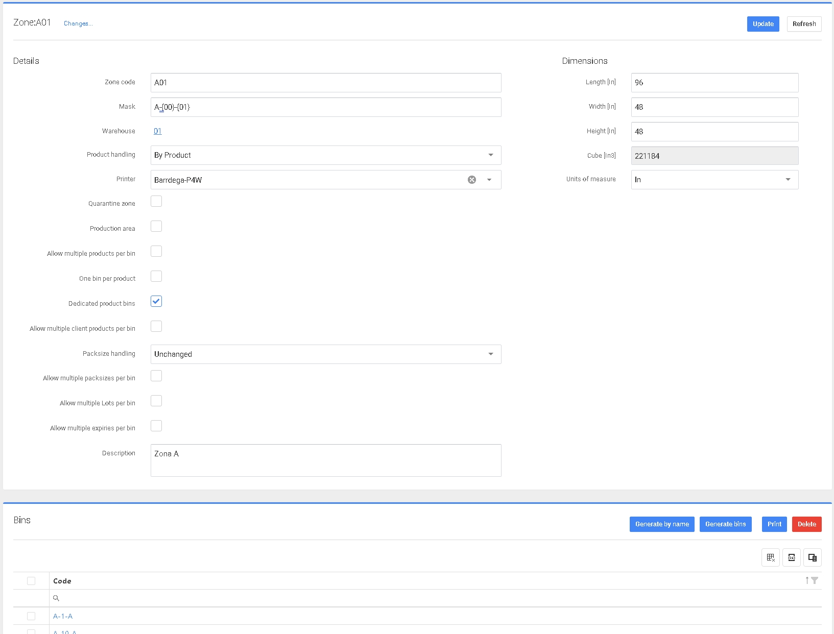 Es importante configurar la impresora de tickets de picking en cada zona, esto es vital si planea utilizar el picking por Zonas. Las dimensiones de las Zonas/Cubos son vitales para varios propósitos.