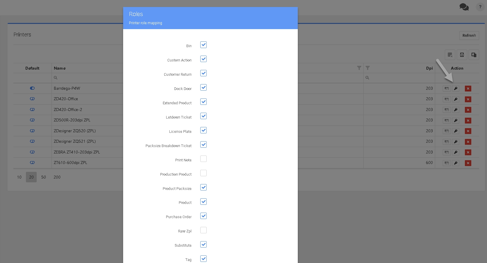 Haciendo clic en el icono de la llave se mostrará la lista de los diferentes tipos de etiquetas. Seleccione el tipo de etiquetas que deben imprimirse en esta impresora. Haga clic en Enviar en la parte inferior de la pantalla después de hacer sus selecciones de etiquetas.
