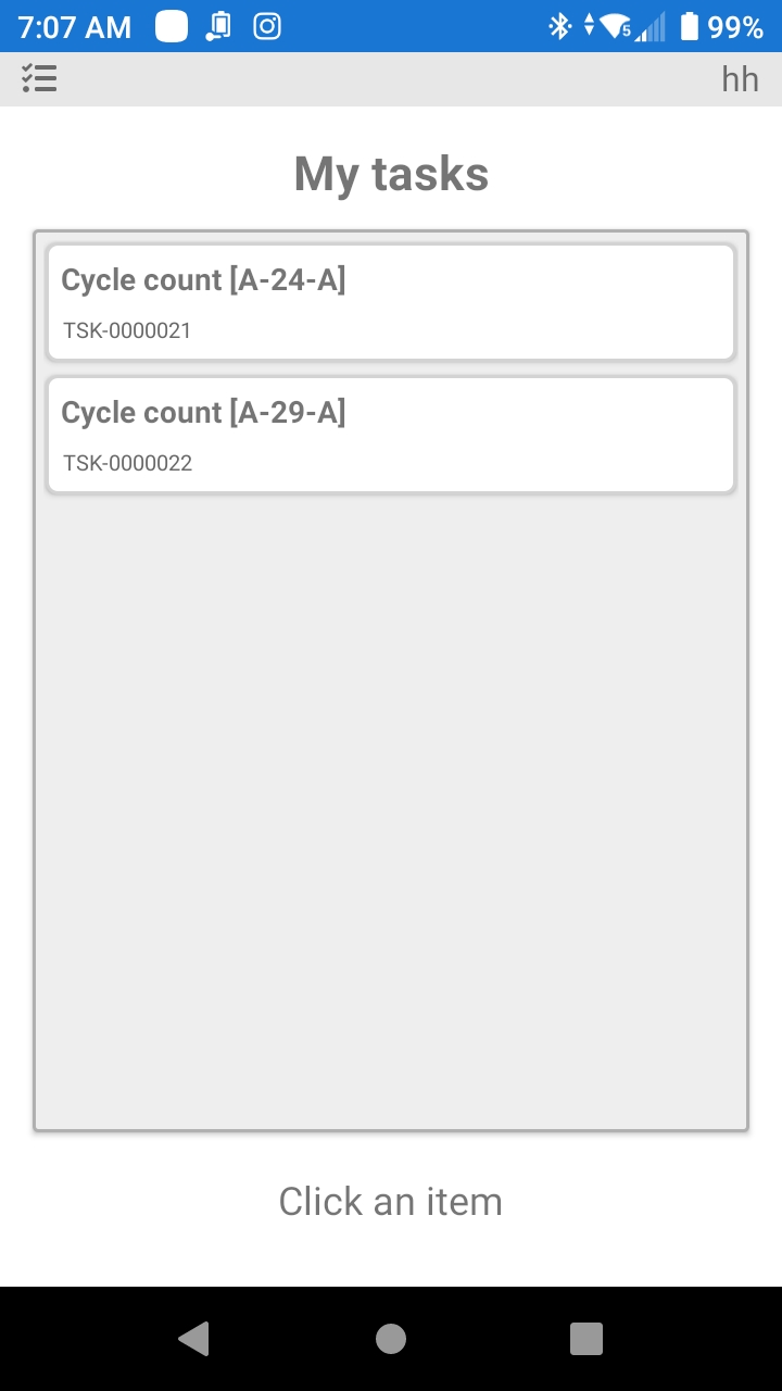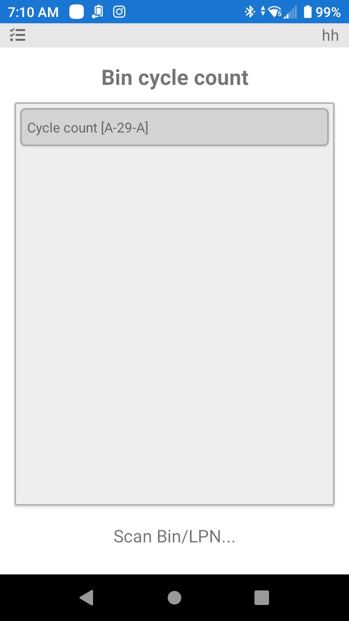 Al hacer clic en la asignación, el usuario será dirigido a la pantalla de recuento de ciclos, donde el usuario PDT verá el contenedor que debe contarse. La asignación permanecerá en la tarea del usuario PDT hasta que se complete. También hay indicadores que muestran el tiempo que ha tardado el usuario en iniciar la tarea y en completarla.
