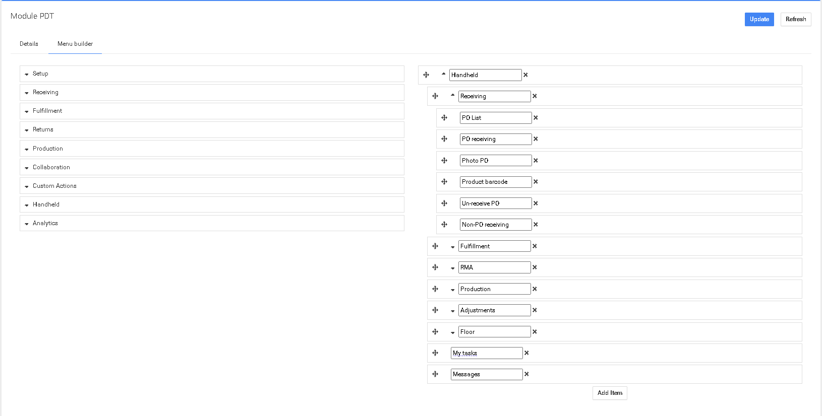 En el submenú Sistema del menú desplegable de la izquierda, seleccione Módulos. Aparecerá la página Módulos, desde la que podrá crear perfiles seleccionando el botón «Nuevo» en la parte superior derecha. Asigne un Nombre (obligatorio) y una Descripción (opcional) y seleccione «Enviar». Ahora se encontrará en la página Módulo desde la que puede seleccionar la pestaña Constructor de menús en la parte superior izquierda. Desde esta página puede arrastrar y soltar (de izquierda a derecha) los distintos menús y submenús que desea permitir para este módulo específico. Puede añadir menús completos o sólo un menú cada vez. También puede añadir un menú y luego eliminar los submenús que desee restringir simplemente seleccionando la «X» negra situada a la derecha de cada opción. Una vez que haya terminado, seleccione el botón «Actualizar» en la parte superior derecha.