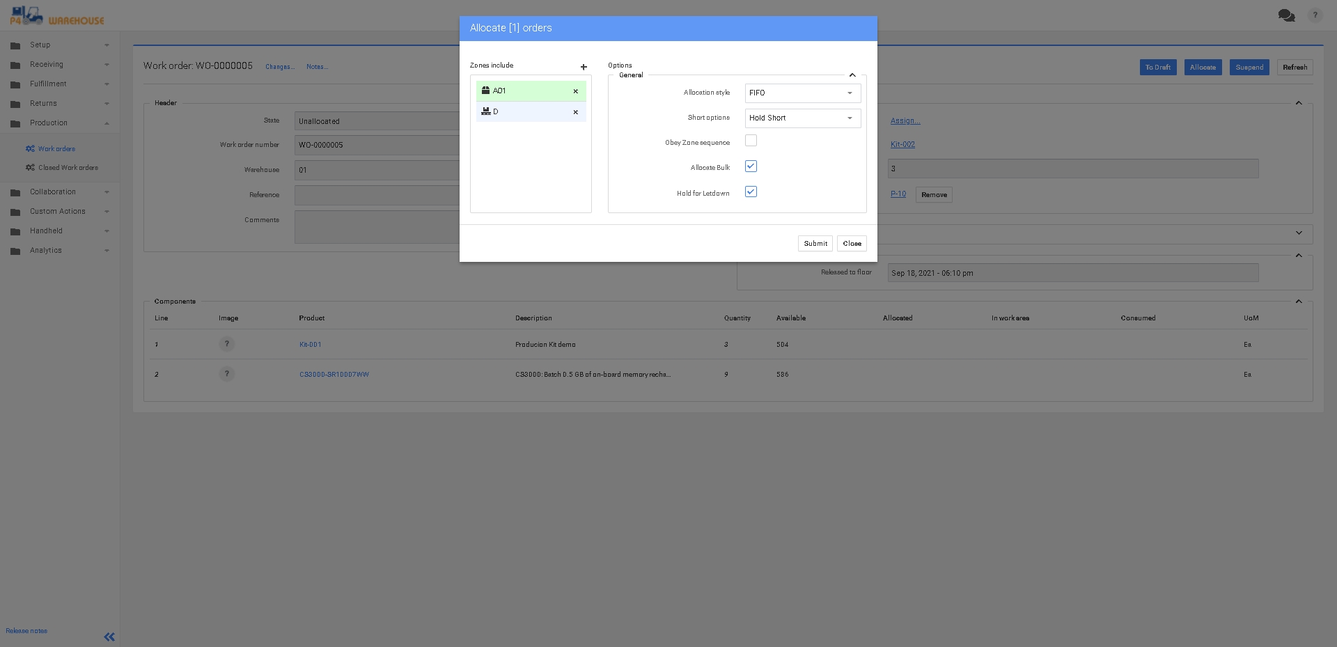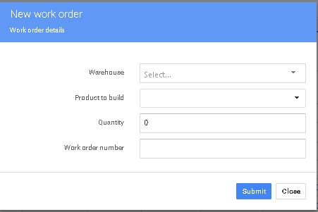 Seleccione el almacén adecuado, seleccione el producto que planea producir, introduzca la cantidad que planea producir, el campo Número de orden de trabajo puede dejarse en blanco y P4 Warehouse generará el número de orden de trabajo de la siguiente secuencia. Haga clic en Enviar.