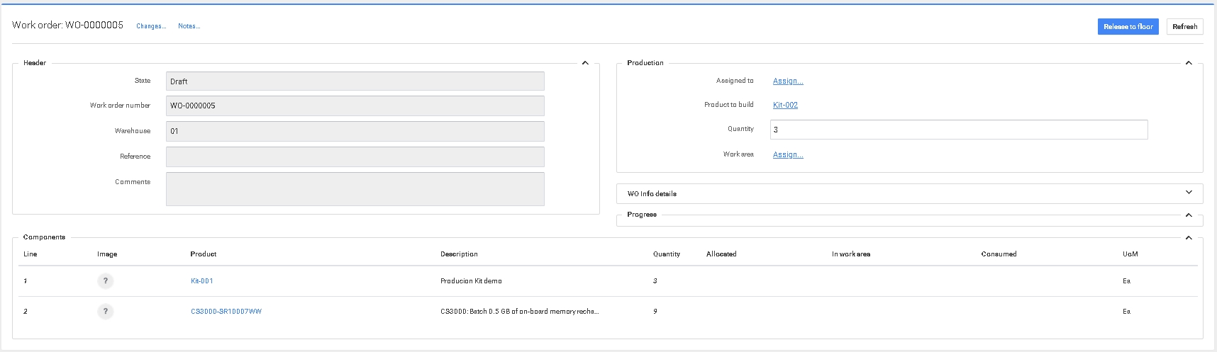 Ahora puede hacer clic en el botón «Release to Floor» en la parte superior derecha de la pantalla, esto moverá la orden de producción de borrador a una orden en vivo. Una vez liberada, haga clic en el botón Asignar.