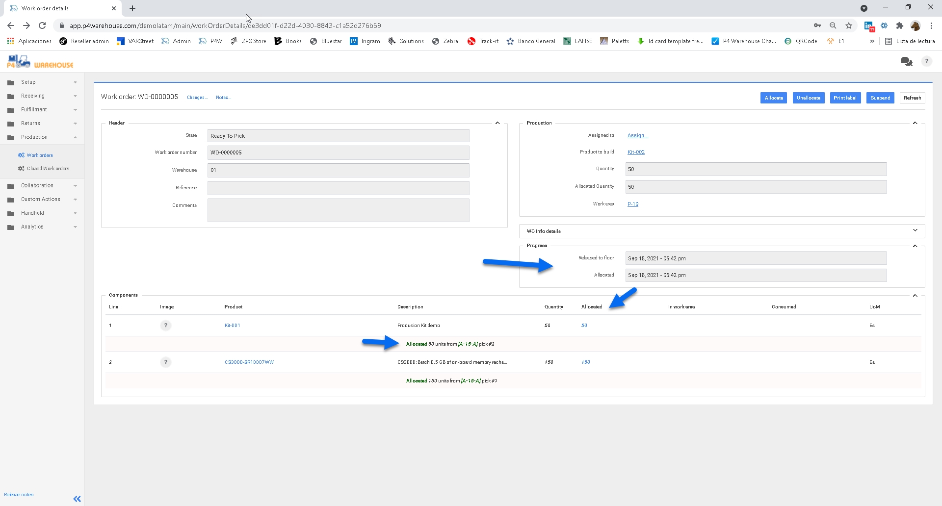 Una vez asignados, verá varios datos nuevos en la pantalla. El siguiente paso consiste en que el usuario de la computadora de mano recoja las materias primas y las traslade al área de producción asignada; una vez que todas las materias primas estén en el área de producción, podrá iniciar el proceso de producción.