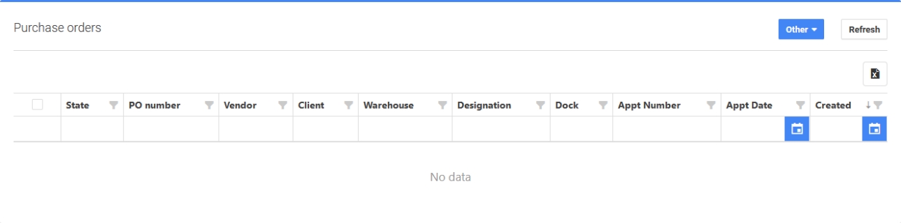 La página de Pedidos Cerrados (Pedidos de Compra) presenta un listado de todos los pedidos de compra cerrados en el software del Sistema de Gestión de Almacenes. Hay columnas para Casilla de Selección, Estado, Número de Pedido, Proveedor, Cliente, Almacén, Designación, Muelle, Número de Pedido, Fecha de Pedido y Creado. También hay un botón «Otros» en la parte superior derecha con dos opciones: Vuelva a cargar (*sáltese por ahora, volverá más tarde) y Correo electrónico (para enviar una notificación por correo electrónico a un tercero). Por último, hay un botón «Actualizar» (para actualizar la lista después de realizar cualquier cambio). El botón «Exportar todos los datos» se encuentra justo debajo del botón de actualización y aparece como una carpeta negra que rodea una X blanca. Las columnas Fecha de cita y Creado tienen un botón Calendario a la derecha. Al seleccionar este botón, aparecerá un menú desplegable en el que podrá seleccionar una fecha del calendario.
