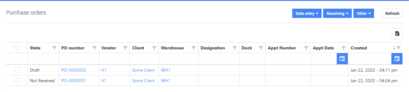 La página de Pedidos Pendientes (Pedidos de Compra) presenta un listado de todos los pedidos de compra pendientes en el software del Sistema de Gestión de Almacenes. Hay columnas para Casilla de Selección, Estado, Número de OC, Proveedor, Cliente, Almacén, Designación, Muelle, Número de Citación, Fecha de Citación (Número y Fecha de Citación; se utiliza cuando el producto debe entregarse en una fecha específica, normalmente el conductor de entrega coordinará con el despachador del almacén) y creado. También hay cuatro botones en la parte superior derecha. El primer botón es «Entrada de Datos» con dos opciones: Nuevo (crear un nuevo pedido) y A borrador (asignar un pedido seleccionado al estado de borrador). El segundo botón es «Recepción» con tres opciones: Liberar a planta (saca un pedido del estado de borrador y lo convierte en una tarea activa que debe realizarse), Asignar operador (asigna un pedido a un operador concreto) y Asignar puerta de muelle (asigna un pedido a una puerta de muelle concreta). El tercer botón es «Otros» con dos opciones: Correo electrónico (para enviar una notificación por correo electrónico a un tercero) y Eliminar (eliminar un pedido seleccionado de la lista). El último botón es «Actualizar» (para actualizar la lista una vez realizados los cambios). El botón «Exportar todos los datos» se encuentra justo debajo de los cuatro botones descritos anteriormente, y aparece como una carpeta negra rodeando una X blanca. Tanto las columnas de Fecha de la cita como las de Creado tienen un botón de Calendario en la parte derecha. Al seleccionar este botón, aparecerá un menú desplegable en el que podrá seleccionar una fecha del calendario.