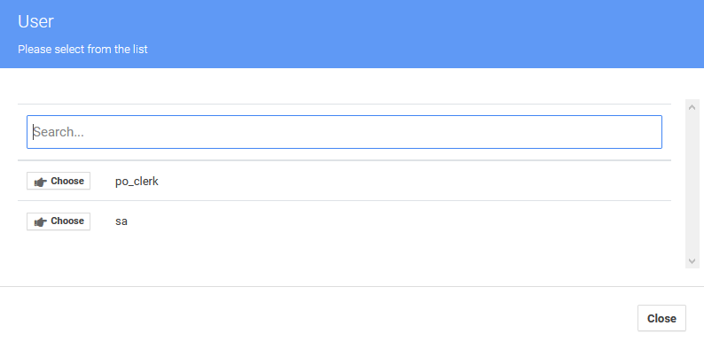 Seleccione la opción de selección de texto «Asignar» y aparecerá una ventana emergente para asignar este pedido a un usuario. En la ventana emergente aparecerá una lista de usuarios existentes con un botón «Elegir» a la izquierda de cada nombre de usuario. Una vez asignado un usuario, la ventana emergente desaparecerá y, de vuelta a la página de perfil del pedido de compra, el campo «Asignado a» mostrará el usuario seleccionado. Ahora también habrá un botón de opción a la derecha para «Eliminar» el usuario asignado.