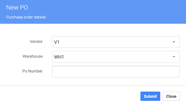 Para crear una nueva orden de compra, seleccione el botón «Entrada de Datos» y elija la opción Nuevo. Aparecerá la ventana emergente Nuevo pedido con opciones para Proveedor, Almacén y Número de pedido. Seleccione el Proveedor y el Almacén en los menús desplegables. Introduzca un número de pedido manualmente o deje el campo vacío (lo que generará automáticamente un nuevo número de pedido). Seleccione el botón «Enviar» y el sistema de Almacén P4 abrirá la página de Orden de Compra.