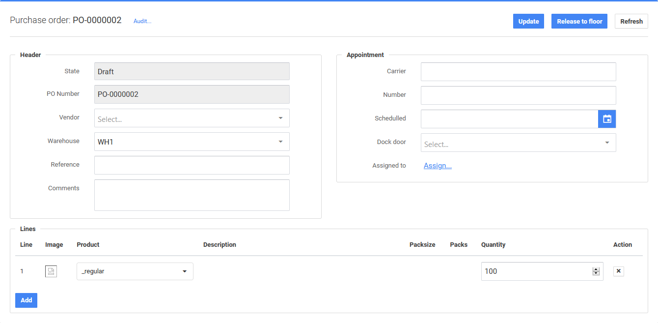 Alternativamente, edite un pedido de compra existente seleccionando el número de pedido de compra en la lista bajo la columna Número de pedido. El sistema P4 Warehouse abrirá la página de perfil de ese pedido en particular. En la parte superior derecha, junto al número de pedido, se encuentra la opción de selección de texto «Auditoría...» que proporciona un registro de seguimiento completo (rastro cronológico de eventos y detalles) sobre este pedido de compra. Debajo está la sección Cabecera para editar Proveedor, Almacén, Referencia y Comentarios. A la derecha se encuentra la sección Cita, donde el pedido puede aplicarse a un transportista, con un número de transportista, una opción Programada para elegir una fecha con un menú desplegable de calendario, una opción Puerta de muelle y la opción de selección de texto «Asignar».