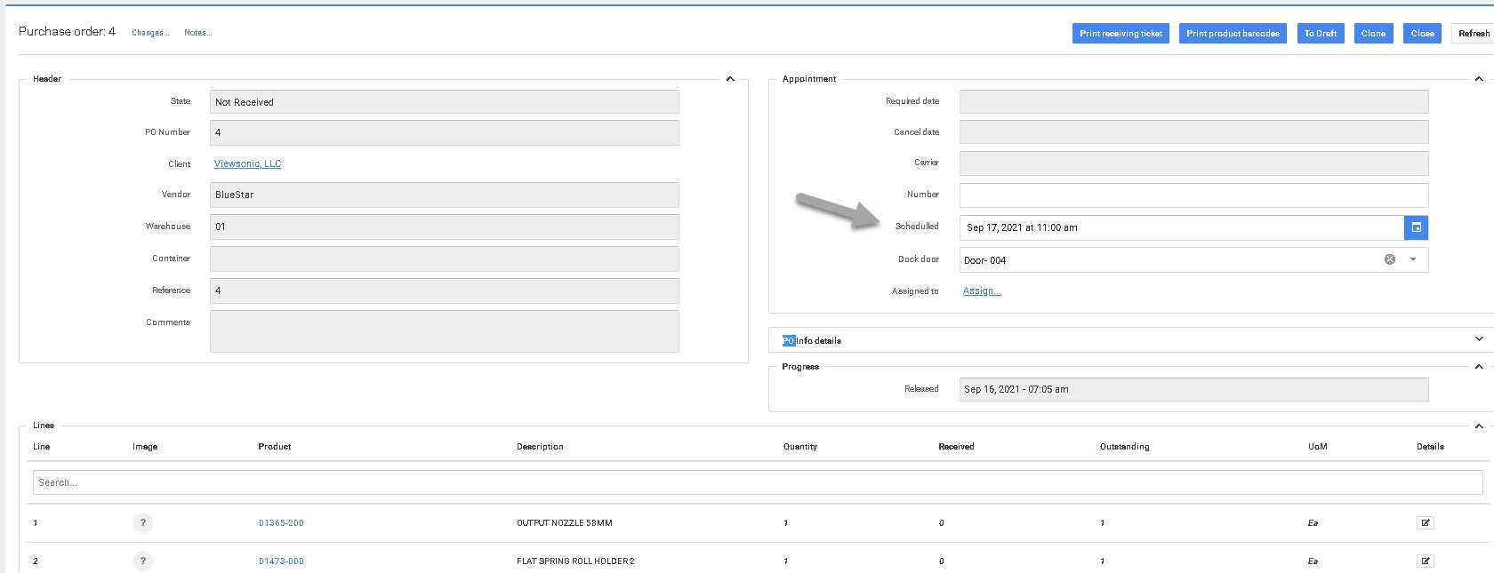 Para fijar la cita, abra la orden de compra e introduzca el número de cita, la fecha y hora programadas y, si es necesario, el número de puerta del muelle.
