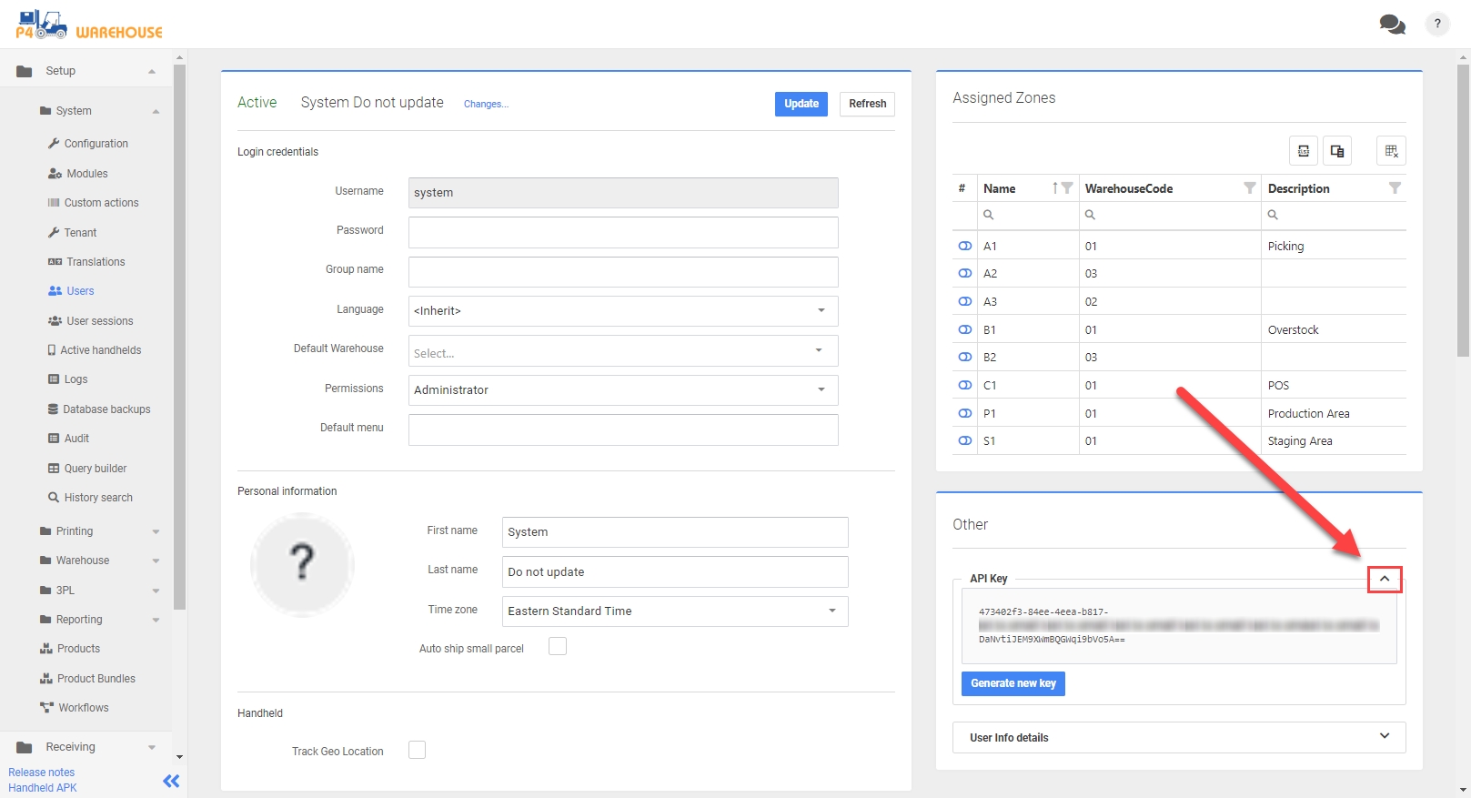 Todas las llamadas y consultas a la API REST requieren una clave de API del sistema. Para obtener la clave, vaya a Configuración > Sistema > Usuario, como se muestra a continuación.