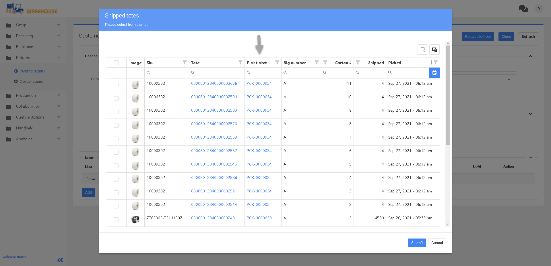 Al hacer clic en «De Enviados» el Almacén P4 mostrará una lista de productos enviados y números de pedido. Filtre para encontrar el producto correcto en el pedido correcto.