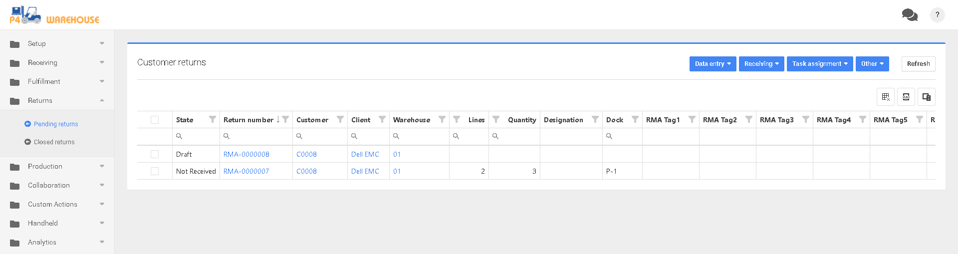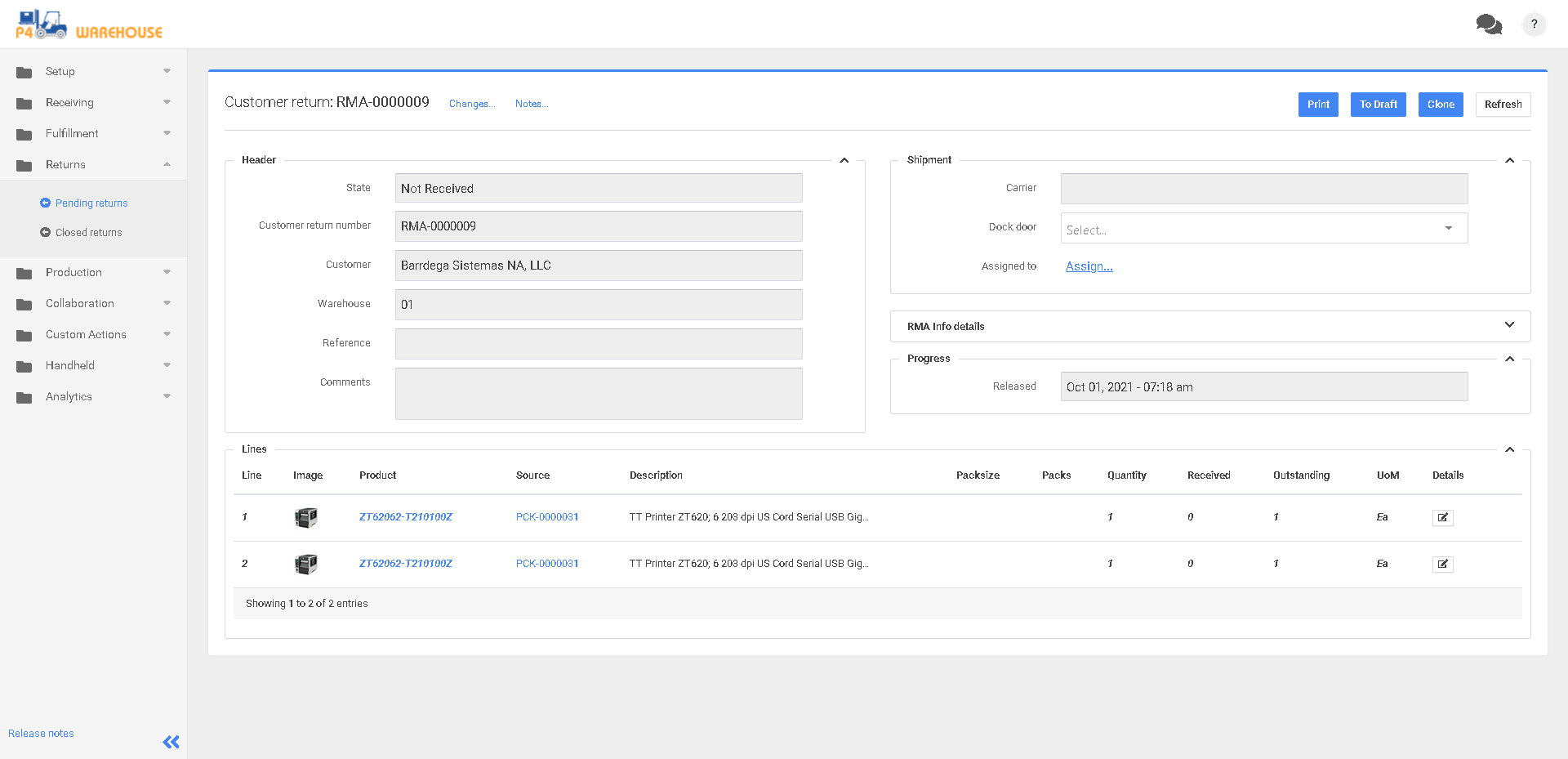 P4 Warehouse Devoluciones abiertas del cliente