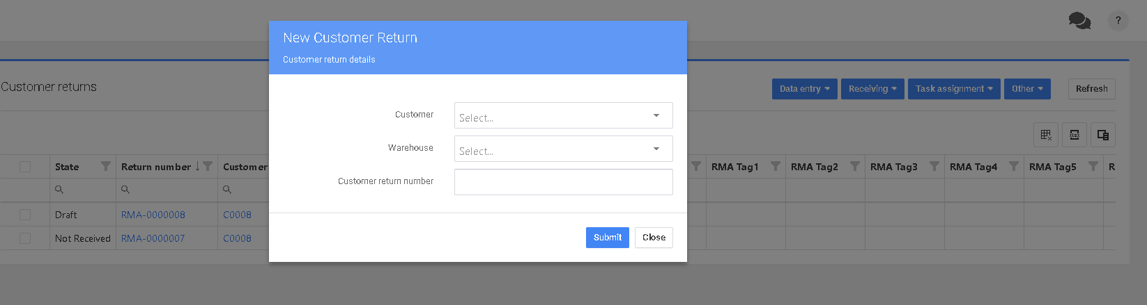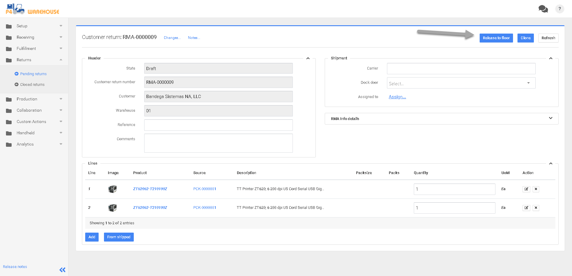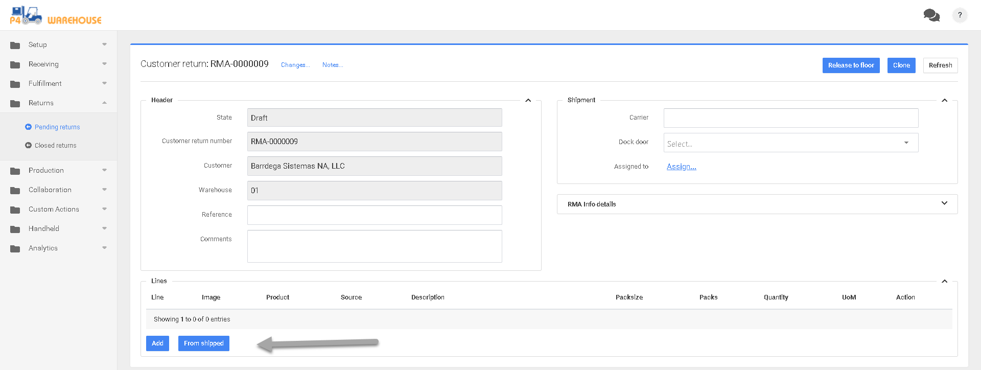 En el campo Nuevas Devoluciones de Cliente, seleccione el cliente y el almacén. Deje el Número de Devolución del Cliente en blanco a menos que esté emparejando la RMA con algún otro sistema, P4 Warehouse creará automáticamente el siguiente número de RMA.