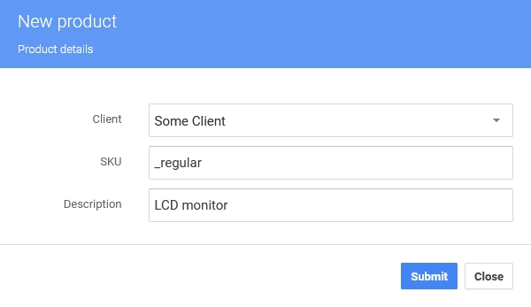 Para añadir un nuevo producto al SGA, basta con seleccionar el botón «Nuevo» para activar un menú emergente con tres opciones: Cliente (el cliente al que pertenece el producto), SKU (Stock Keeping Unit) y Descripción. Rellene cada una de las opciones y, a continuación, seleccione el botón «Enviar».