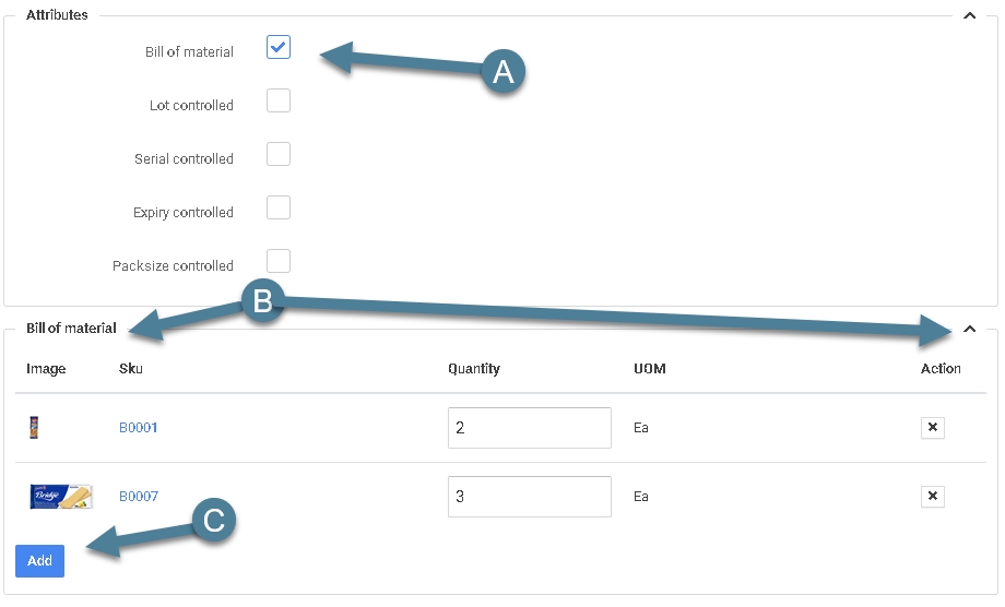 Después de crear un nuevo Producto seleccione el atributo «Lista de Materiales» Verá una nueva opción debajo del área de atributos para añadir los subcomponentes a la Lista de Materiales.