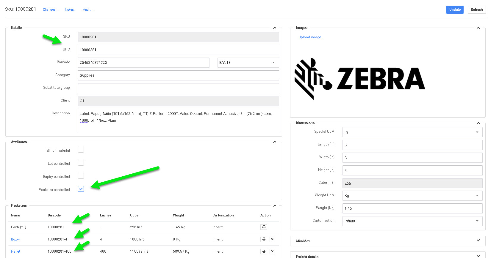 P4 Warehouse puede tener un número ilimitado de tamaños de envase por producto. Cada tamaño de paquete debe estar identificado por un código de barras único. Si cada tamaño de envase tiene un código de barras único, P4 Warehouse no le preguntará qué tamaño de envase está procesando, el software simplemente le pedirá la cantidad de envases.