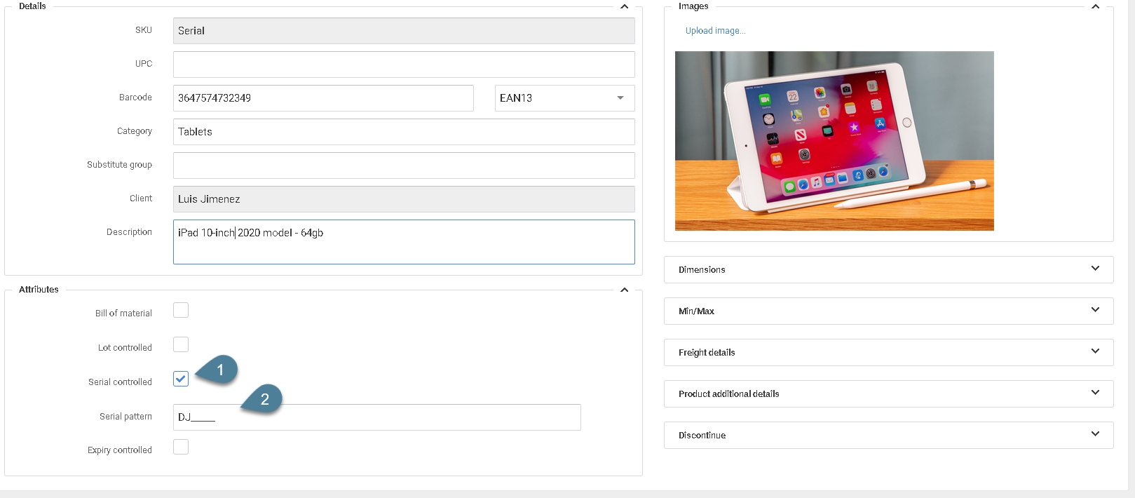Después de crear el producto básico como se indica aquí. Seleccionará el atributo serie controlada. Si su producto siempre llega con la misma secuencia para el número de serie, puede añadir una máscara de número de serie para evitar escanear accidentalmente el código de barras equivocado en el campo de número de serie. En la foto de abajo la máscara es DJ más cinco dígitos. Los dígitos desconocidos se indican con un guión bajo _.