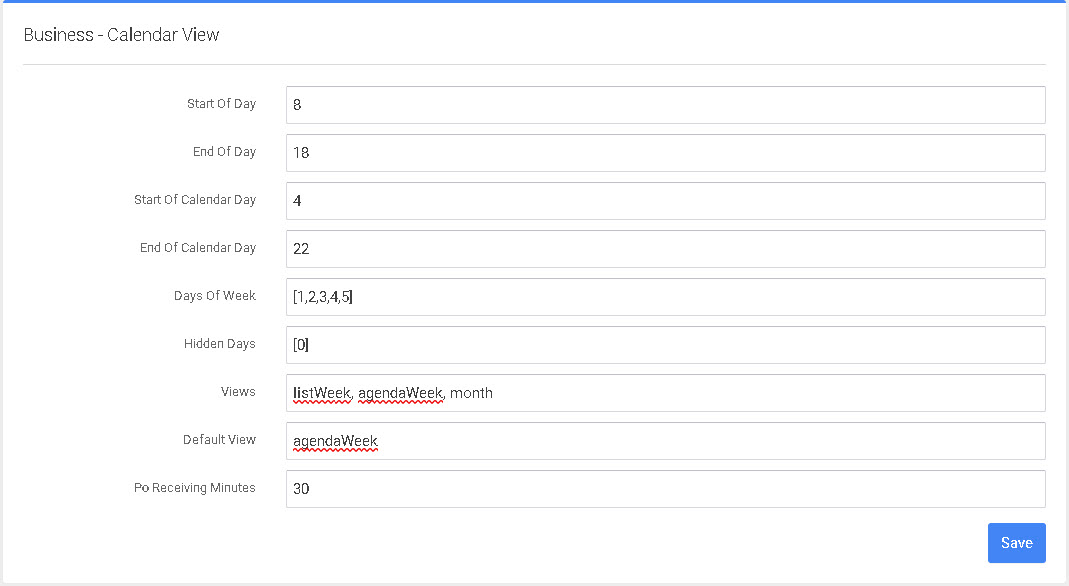 Esta página de configuración incluye Inicio del día (inicio de la jornada laboral en horas, por defecto: 8), Fin del día (fin de la jornada laboral en horas, por defecto: 18), Inicio del día del calendario (corte superior de la vista del calendario, por defecto: 4), Fin del día del calendario (corte inferior de la vista del calendario, por defecto: 22), Días de la semana (días laborables de la semana 0-Domingo 1-Lunes 2-Martes; por defecto: [1,2,3,4,5]), Días ocultos (por defecto: [0]), Vistas (opciones de vista como mes, agendaSemana, semanabásica, listaSemana, agendaDía, díabásico, listaDíapordefecto), Vista por defecto (vista que se cargará al inicio; por defecto: agendaSemana) y Minutos de recepción de pedido (número aproximado de minutos para recibir un pedido; por defecto: 30). Tras modificar cualquier entrada, seleccione el botón "Guardar" situado en la parte inferior derecha.