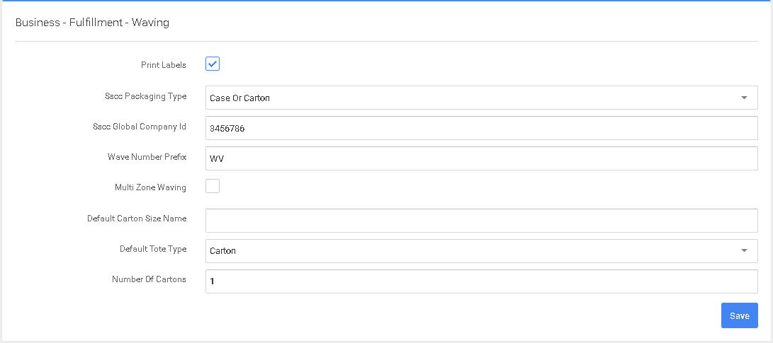 Esta página de configuración incluye el Tipo de Embalaje SSCC (las opciones son Caja o Cartón, Palé, Uso Intraempresa o Indefinido), el ID Global de la Empresa SSCC, el Prefijo del Número de Onda (por defecto: WV), la Ondulación Multizona (casilla de verificación), el Número de Cartones (por defecto: 1) y el Número de Copias (por defecto: 1).