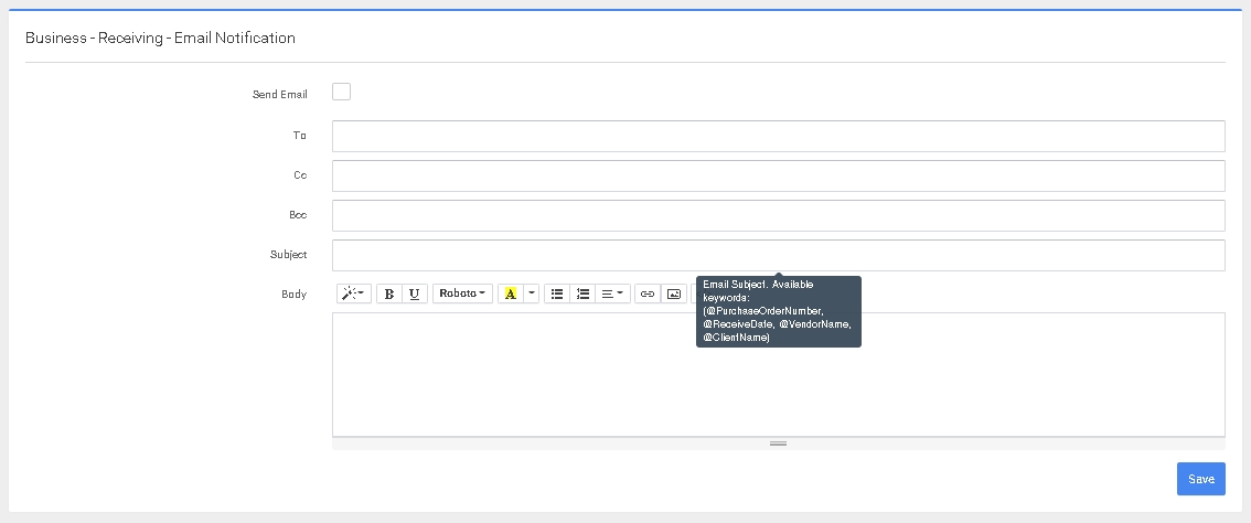 Esta pantalla le permitirá enviar automáticamente un pdf a los destinatarios de su elección cuando se cierre una Orden de Compra.