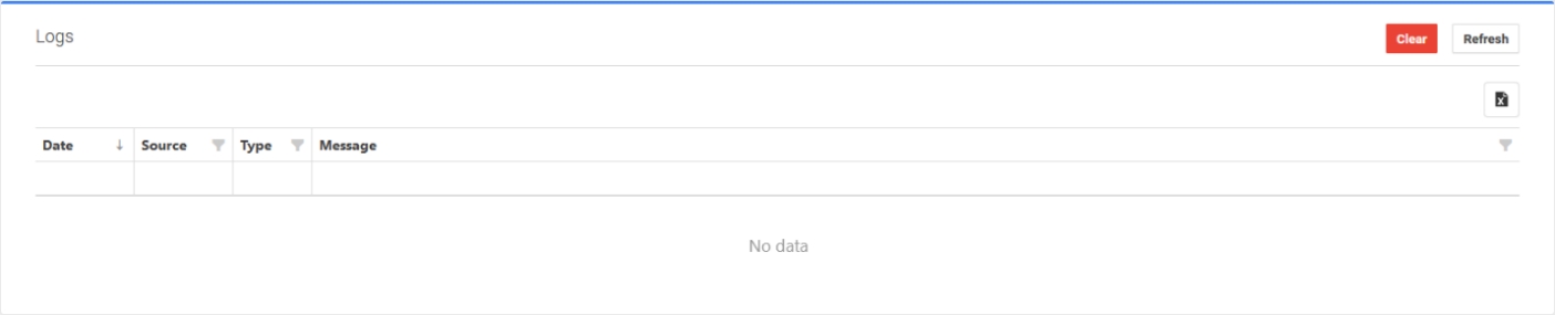 Registros es una lista de la actividad del sistema. Sólo hay tres funciones disponibles en esta página: los botones «Borrar», «Actualizar» y «Exportar todos los datos», todos ellos situados en la parte superior derecha de la pantalla. El botón Exportar todos los datos aparece como una carpeta negra que rodea una X blanca. Las columnas Fecha, Origen y Tipo también tienen conmutadores básicos de manipulación de datos junto al nombre de la columna. La columna Mensaje muestra el tipo de mensaje de error.