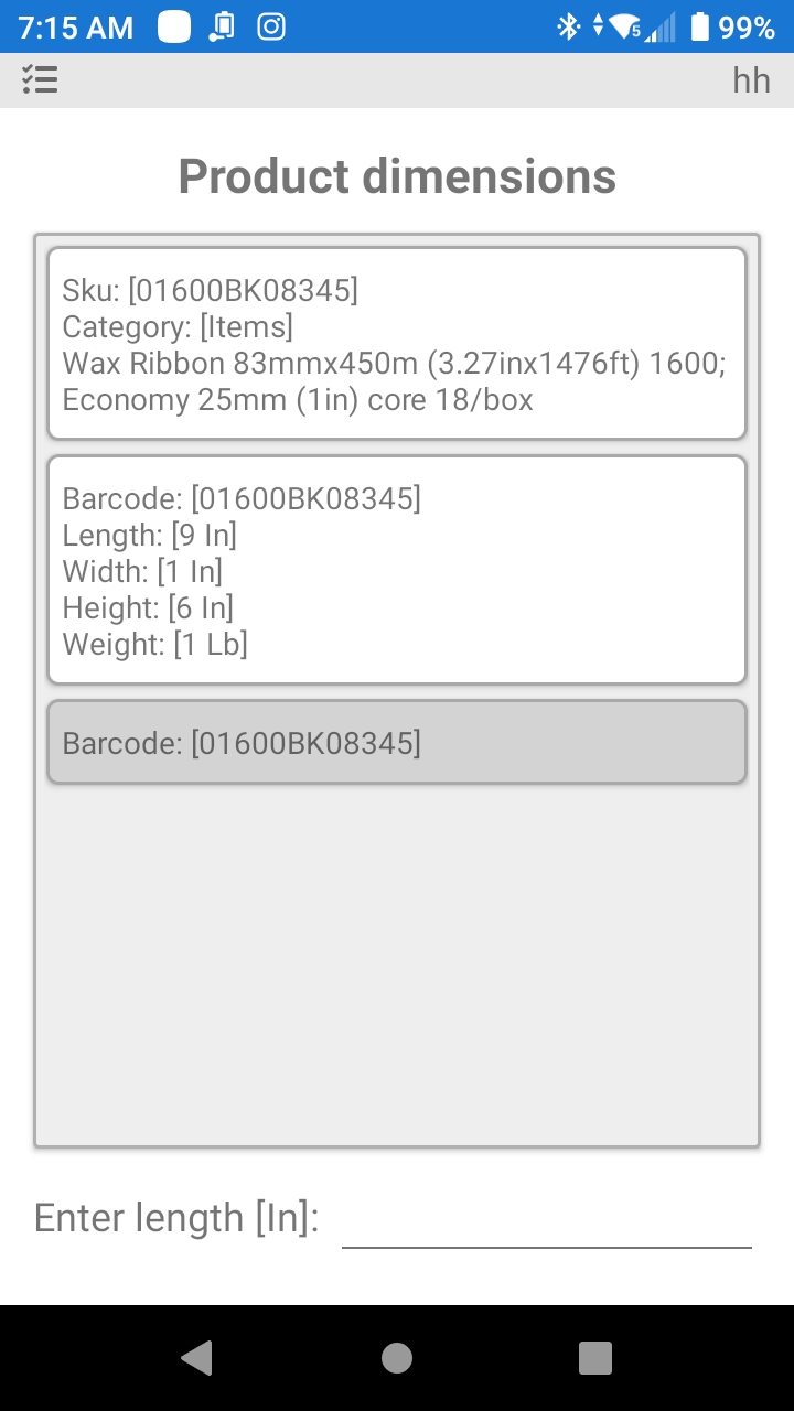 Las dimensiones del producto y los datos del código de barras pueden recogerse desde el PDT. Al entrar en la función PDT de dimensiones del producto y, a continuación, escanear el producto, se le presentarán las opciones para introducir los datos dimensionales del producto y los diferentes tamaños de envase (si el producto tiene tamaños de envase).