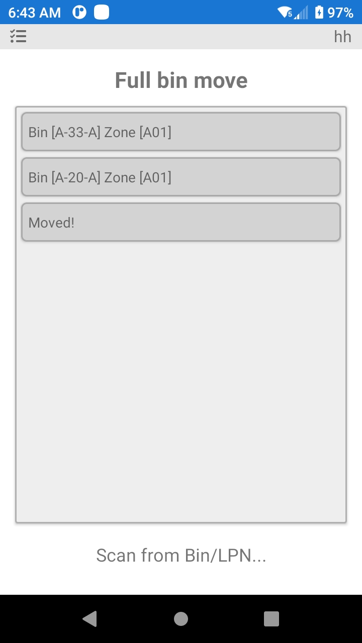 El sistema de almacén P4 muestra ahora que todos los productos de la ubicación A-33-A se han trasladado a la ubicación A-20-A.