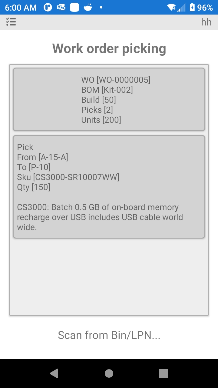 En esta pantalla comenzará el proceso de recogida de la mercancía en bruto y el traslado de esta mercancía a la zona de producción asignada.