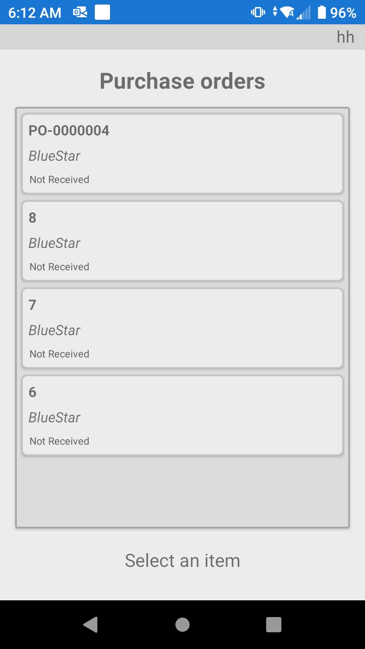 Aquí verá una lista de órdenes de compra abiertas, puede seleccionar la Orden de Compra para comenzar el proceso de recepción.