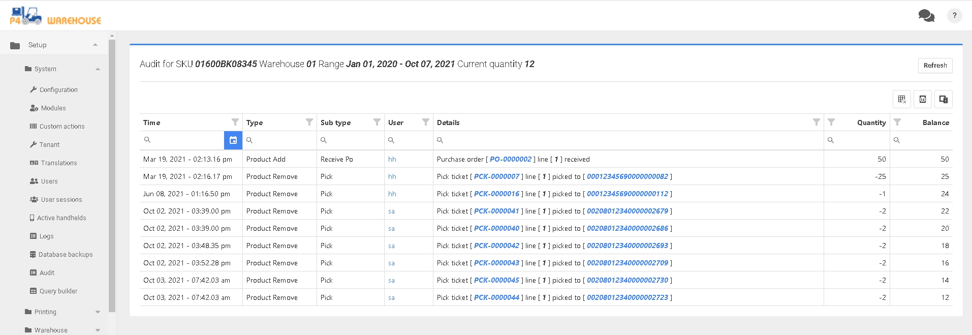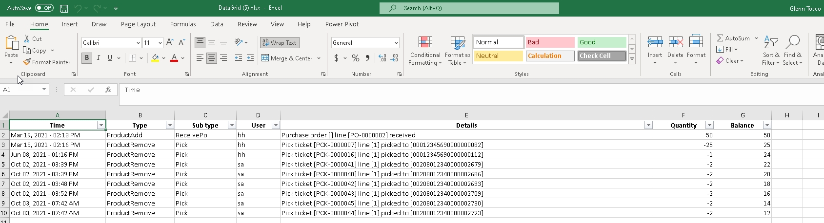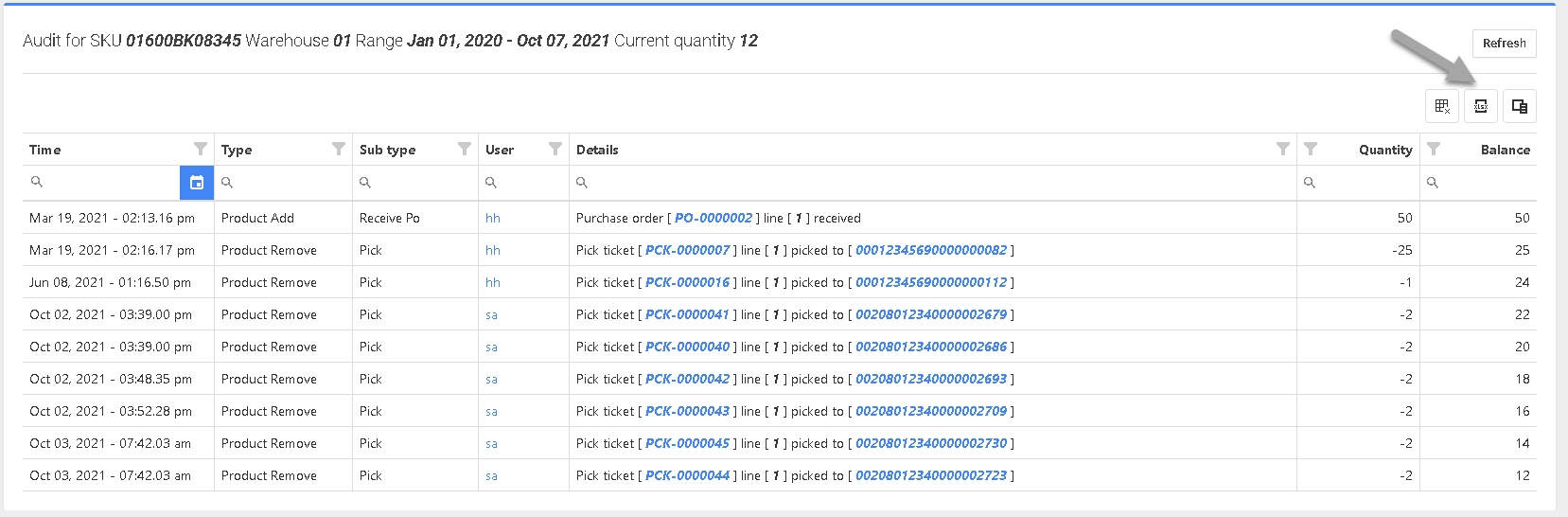 En esta pantalla hay una auditoría completa del producto, cada transacción que aumente o disminuya el recuento de inventario se presentará aquí. Haciendo clic en el botón de exportación a Excel puede exportar estos datos a Excel.