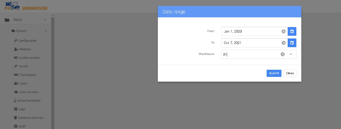 Después de seleccionar el intervalo de fechas y el almacén correctos, haga clic en el botón Enviar. (Deje el almacén en blanco para ver todos los almacenes)