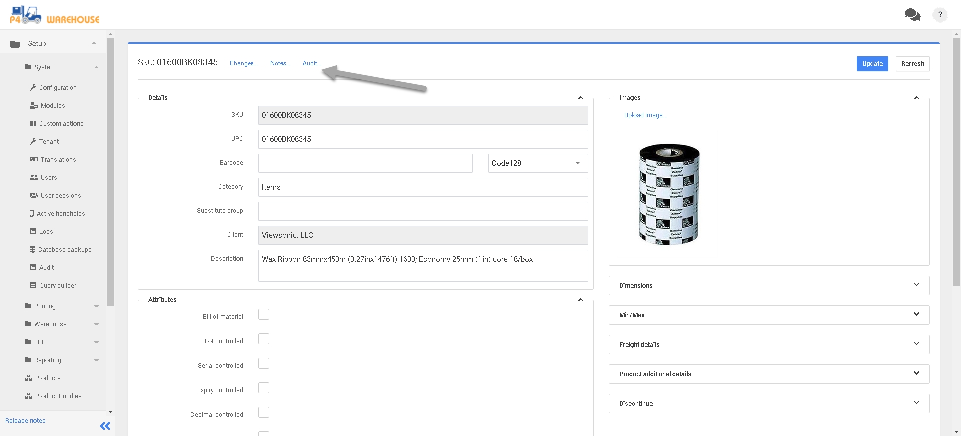 Abra el maestro de productos para el producto que desea auditar y haga clic en el enlace de auditoría en la parte superior izquierda de la pantalla.
